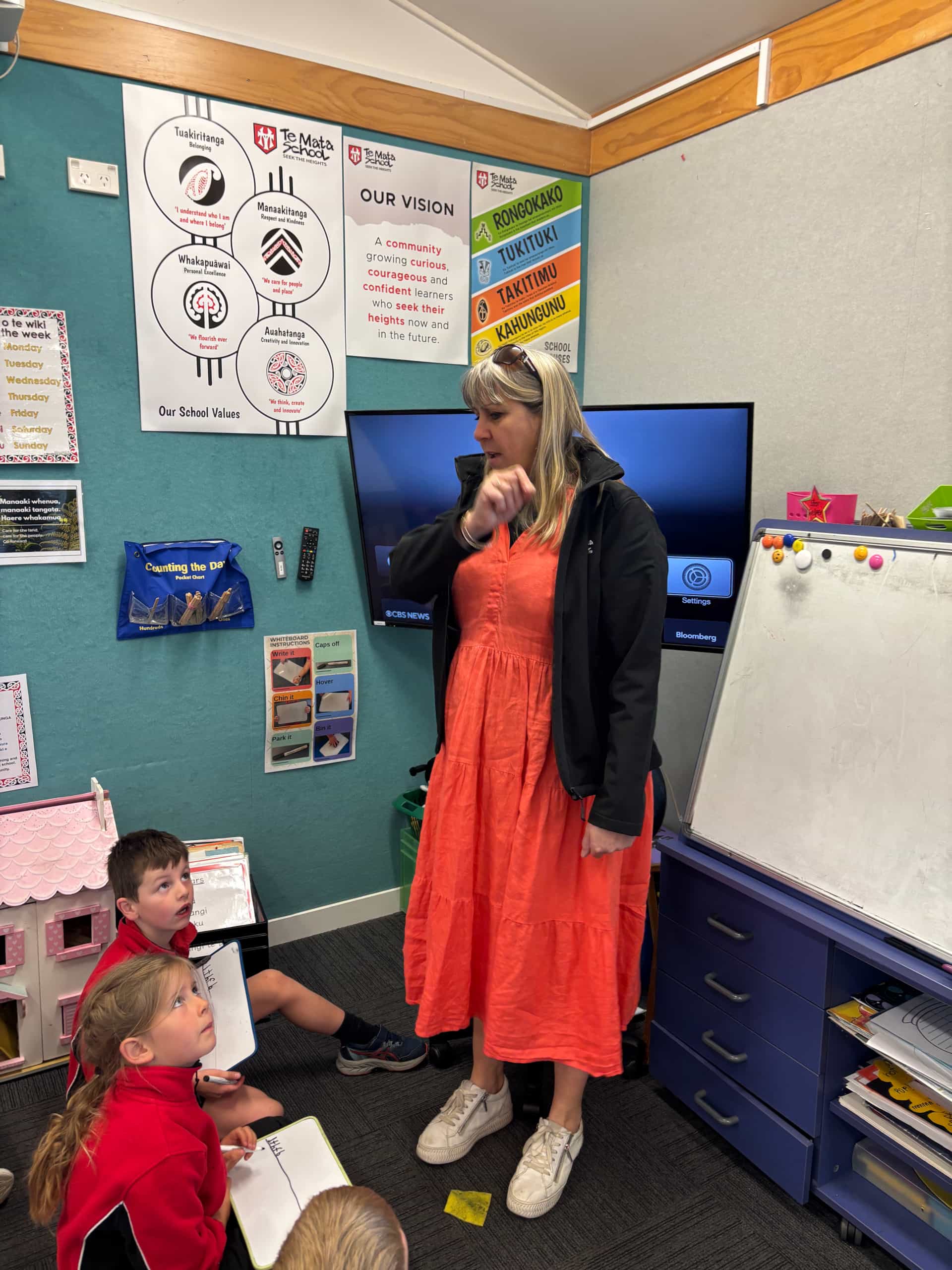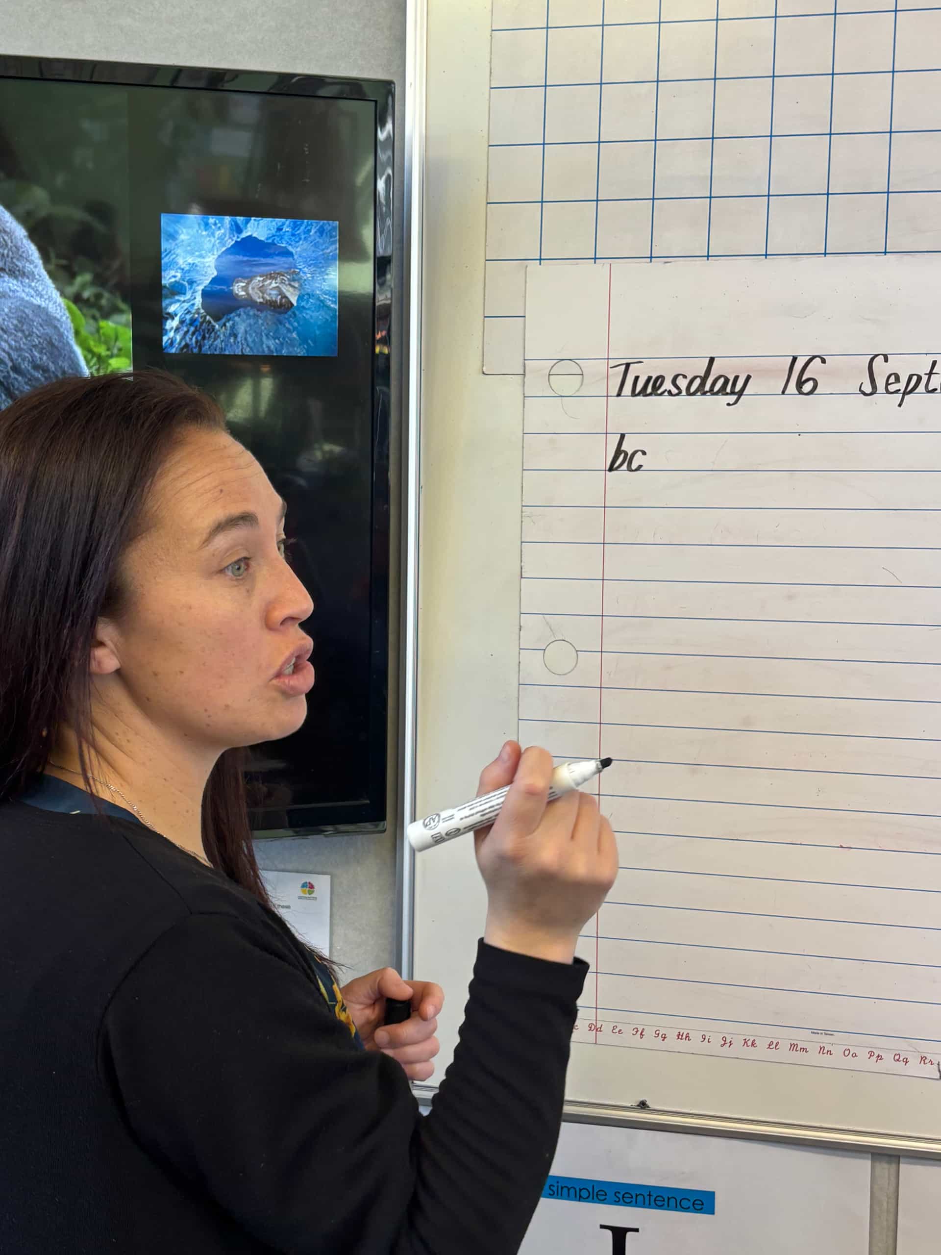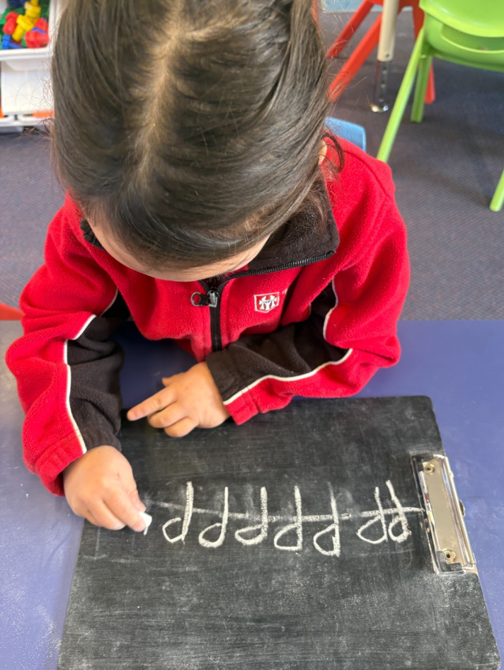 In Kororā Kids (Year 0), students practise handwriting on blackboards using small pieces of chalk. This provides tactile feedback and strengthens correct grip.
